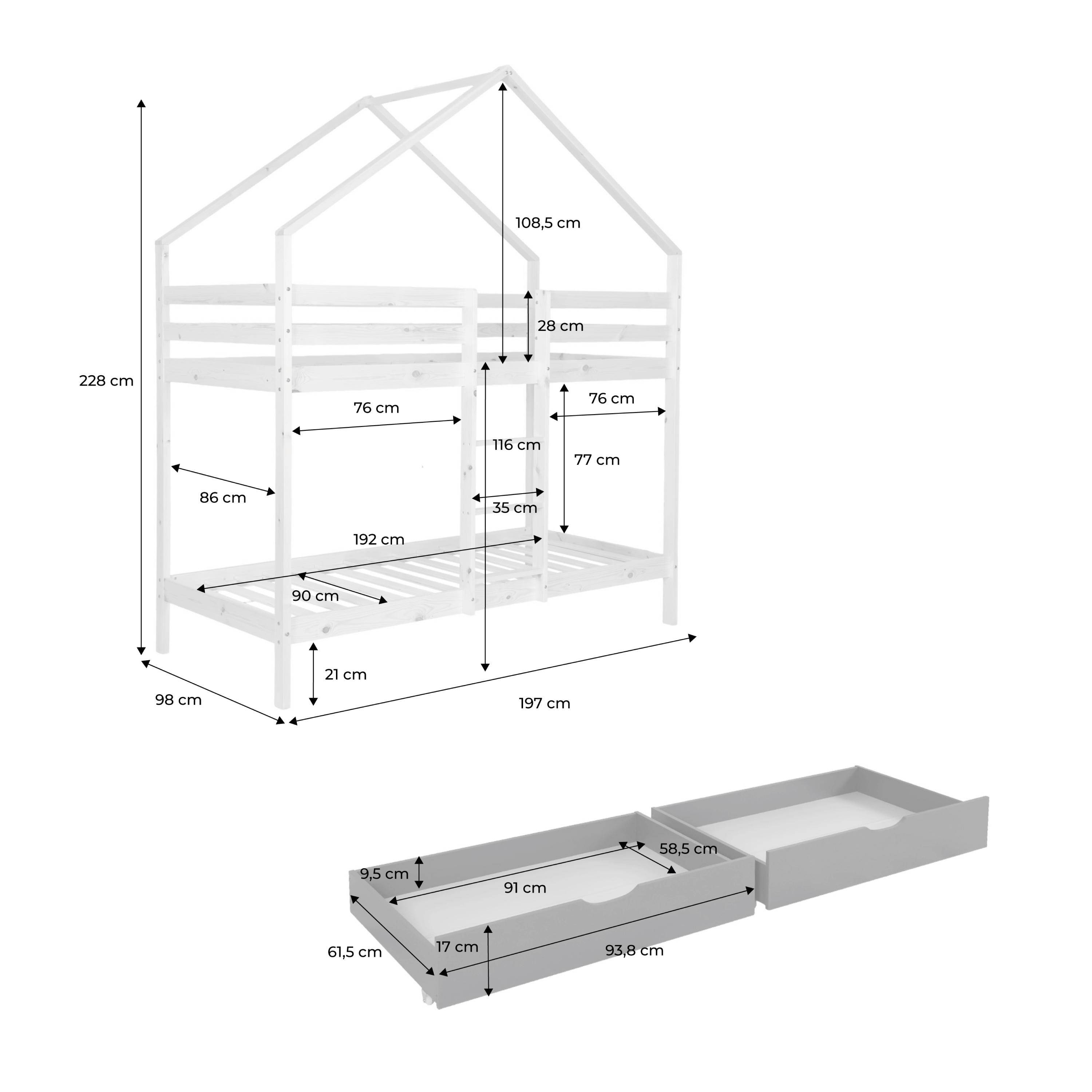 Il letto a castello Roya porta una vera dose di magia nella camera dei bambini. Il suo stile scandinavo in pino naturale diffonde un'atmosfera dolce e confortante, perfetta per creare uno spazio ideale per crescere bene. A forma di piccola casa, diventa presto il loro terreno di gioco preferito: aggiungi qualche ghirlanda luminosa sul tetto e l'immaginazione farà il resto. Astuto e pieno di fascino, il letto Roya è dotato di spazi sotto il letto inferiore per aggiungere cassetti e non ingombrare la stanza. La scala, semplice e stabile, conduce al letto superiore, posizionato abbastanza in alto per sognare un po' più in alto. Un mobile caldo, pratico e poetico, che mette stelle negli occhi dei bambini e un grande sorriso sui volti dei genitori.