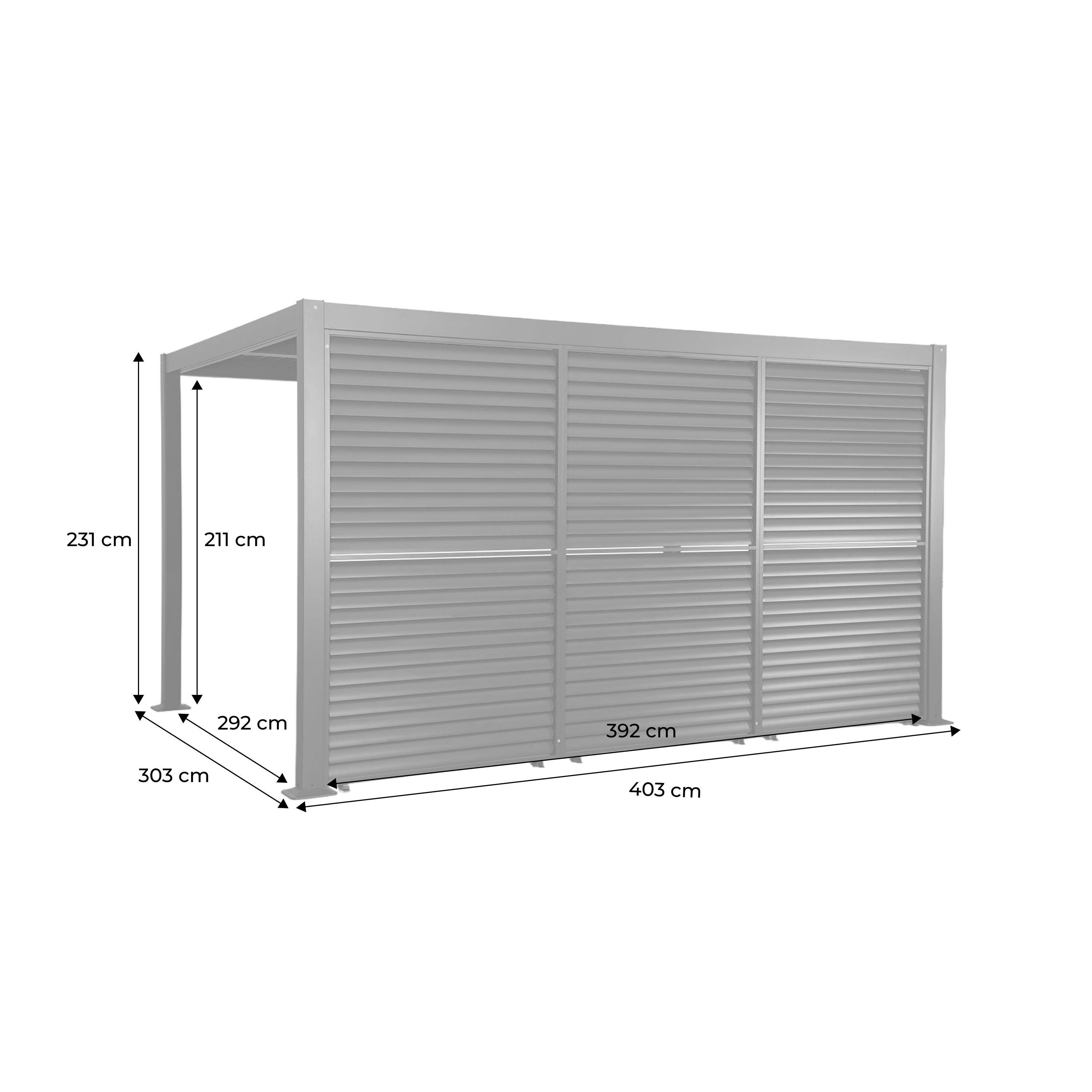 Trascorri momenti piacevoli e conviviali nel tuo giardino grazie alla pergola bioclimatica Palace 3x4m. Questa pergola ha la particolarità di adattarsi al meteo. Ti protegge dalla pioggia in inverno e ti permette di goderti il sole in estate e di apprezzare la sua ombra e freschezza. La pergola è un'installazione permanente poiché va fissata nel terreno. Non c'è bisogno di riporla in inverno, potrai goderne tutto l'anno. Grazie al suo design leggero ed elegante, apporterà una nota di modernità nel tuo giardino. Con le sue dimensioni, troverà facilmente posto sopra un tavolo da giardino, una spa o vicino alla tua piscina.