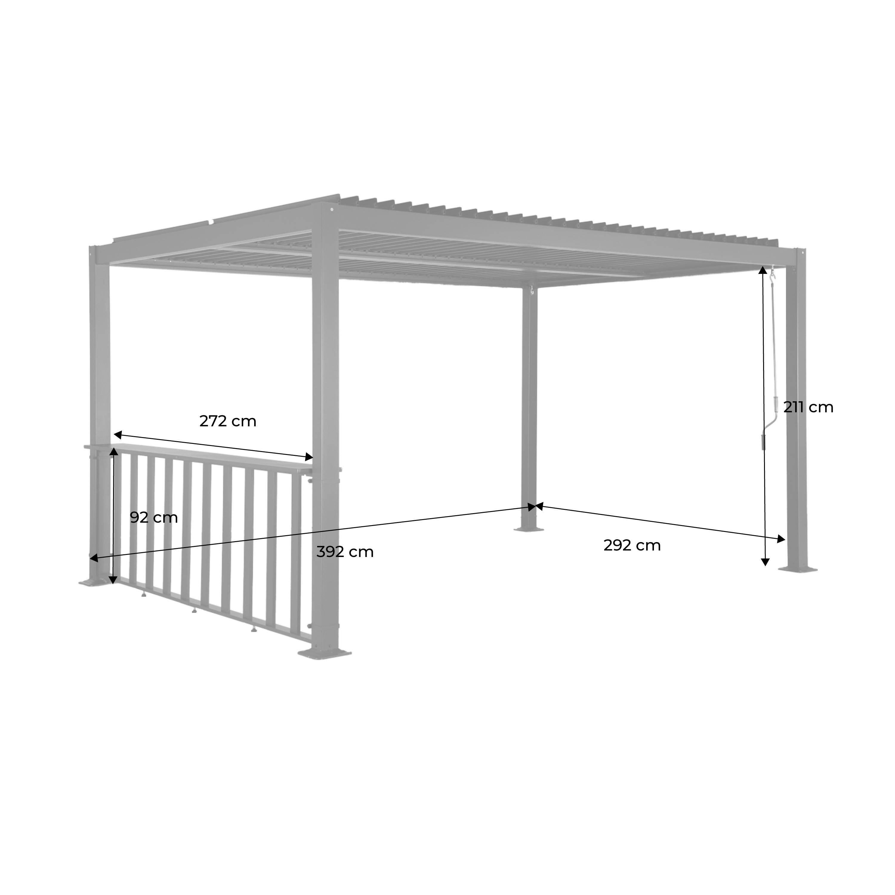 Il bar Palace vi invita a condividere bei momenti. Installato sul lato di 3 m della vostra pergola, diventa un luogo pratico ed elegante per posare i vostri bicchieri, servire qualche snack o godere di un momento tra amici. Il suo alluminio leggero e resistente assicura una buona durata nel tempo, apportando un'estetica curata che si fonde naturalmente con il vostro esterno. Struttura sottilmente lo spazio, creando un'atmosfera accogliente dove ogni momento, che si tratti di un pomeriggio soleggiato o di una serata rilassata, diventa più piacevole e confortevole.