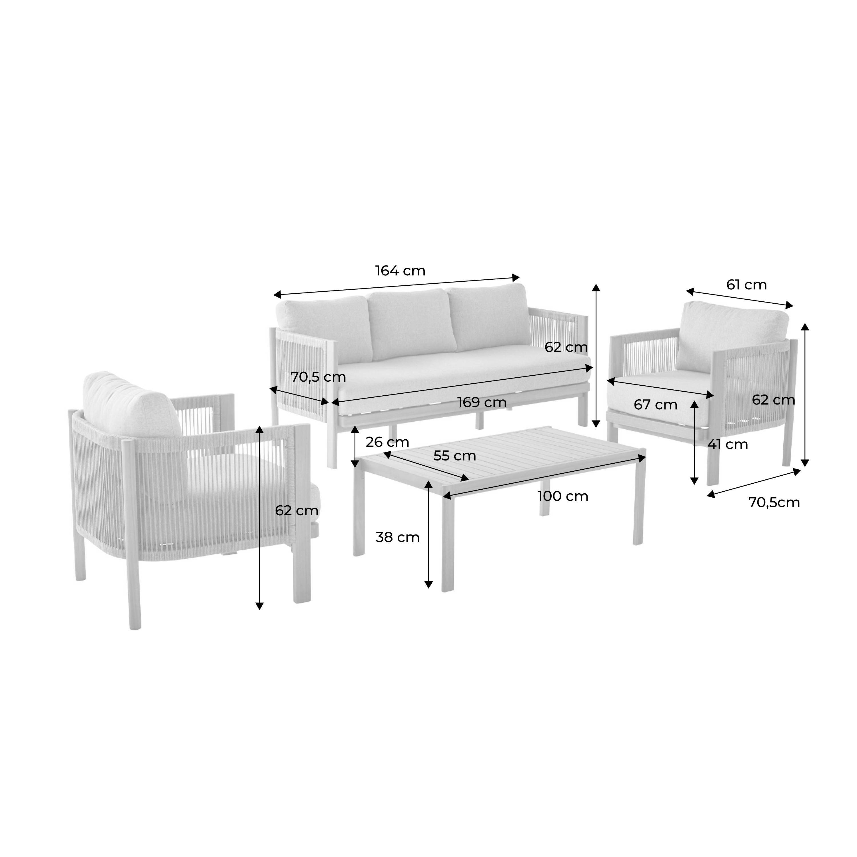 Questo salotto è realizzato con una struttura robusta in legno di acacia, noto per la sua resistenza agli elementi e la sua durabilità. Le sedute sono abilmente intrecciate con una corda di alta qualità, aggiungendo un tocco di eleganza e flessibilità. Le forme pulite e le finiture curate mettono in risalto il design contemporaneo e lineare dell'insieme.
